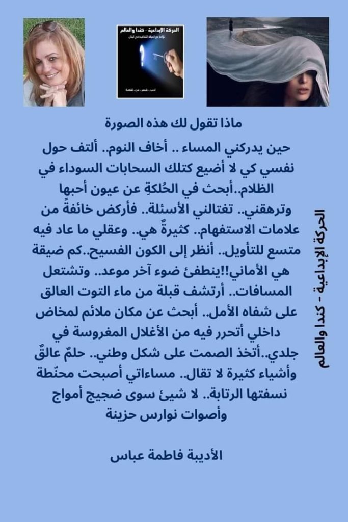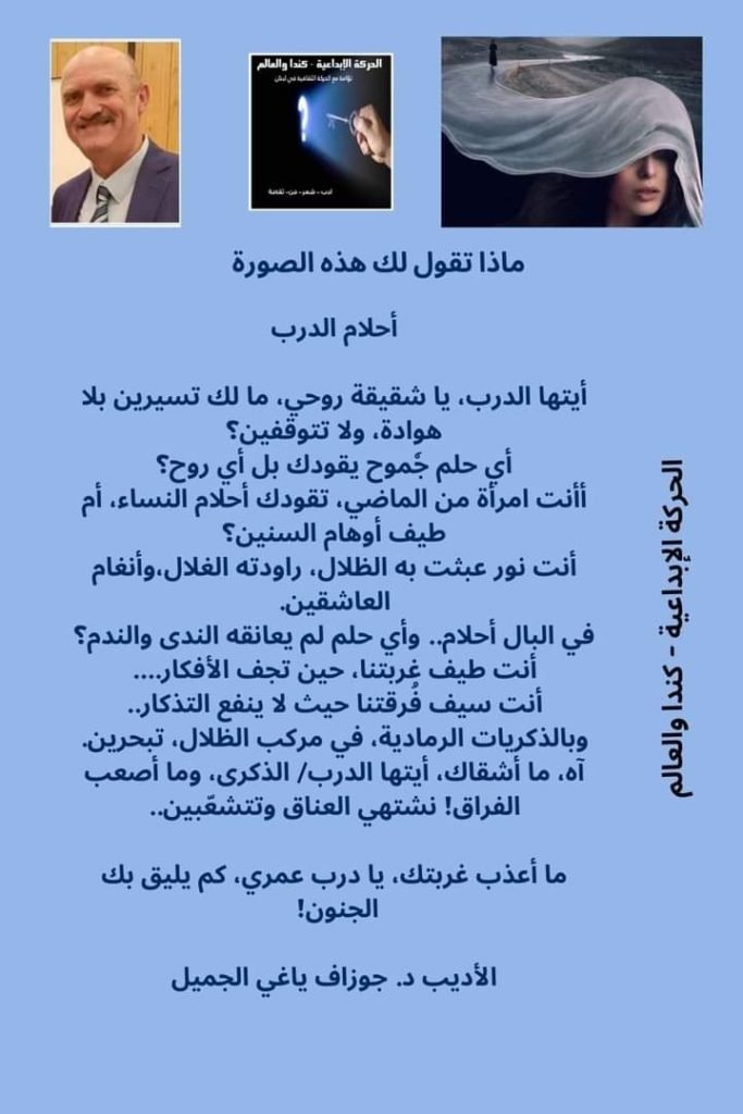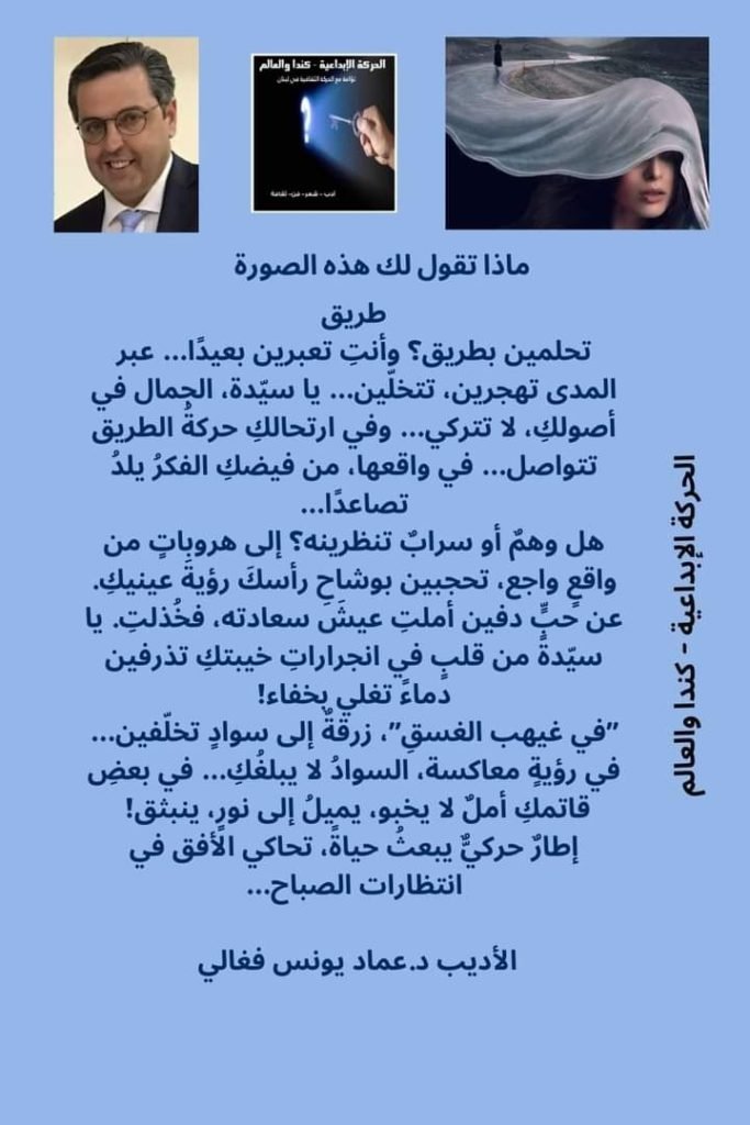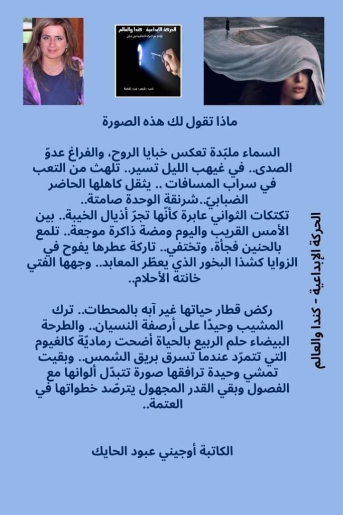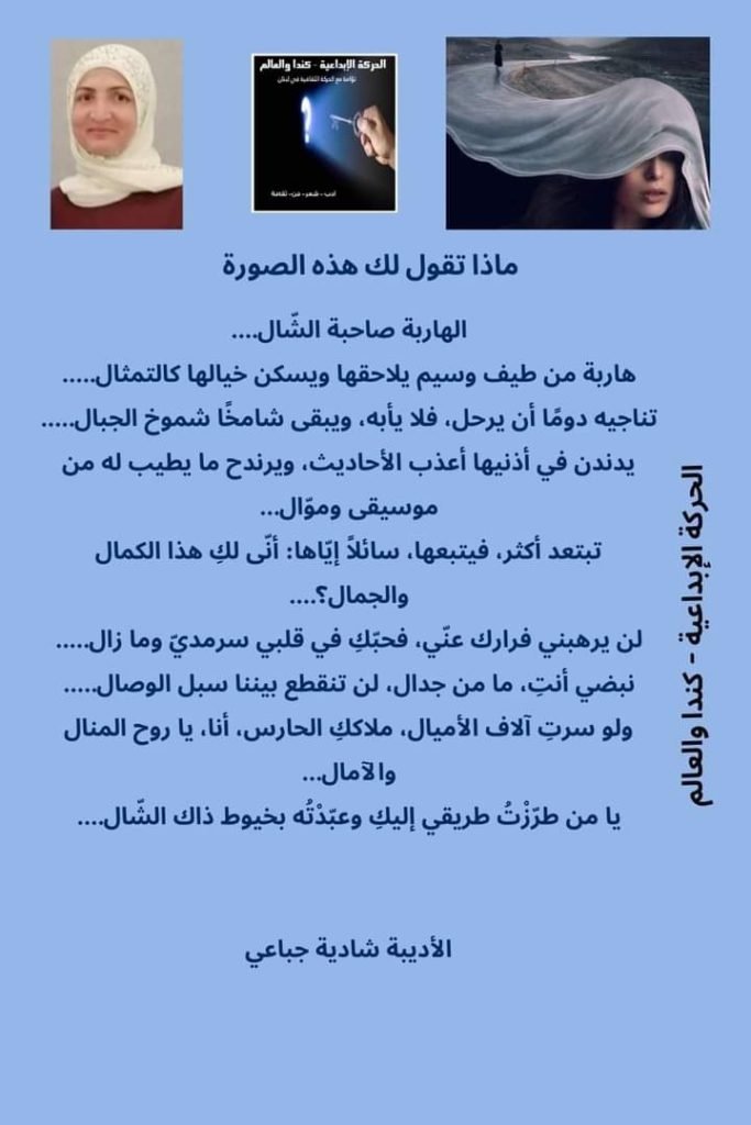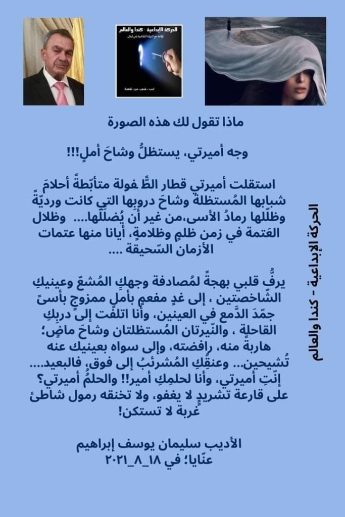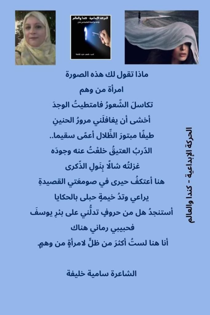 هل وهمٌ أو سرابٌ تنظرينه؟ إلى هروباتٍ من واقعٍ واجع، تحجبين بوشاحِ رأسكَ رؤيةَ عينيكِ. عن حبٍّ دفين أملتِ عيشَ سعادته، فخُذلتِ. يا سيّدةً من قلبٍ في انجراراتِ خيبتكِ تذرفين دماءً تغلي بخفاء!