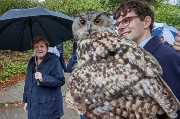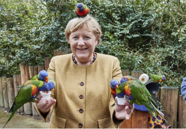 خلال زيارة المستشارة الألمانية أنجيلا ميركل إلى حديقة الطيور(Marlow) -المانيا ، يوم الخميس الماضي. أحاطت بها الببغاوات حتى أن أحد الببغاوات وقف على رأسها، كانت ميركل تحمل العصير في يديها لإطعام الببغاوات و كانت مسرورة جدا و لم تبد أي انزعاج، فقط تمنعت عن حمل بومة يبلغ طولها ٦٠ سم قائلة : ” ابلي حسنا مع الببغاوات و هذا جيد ”