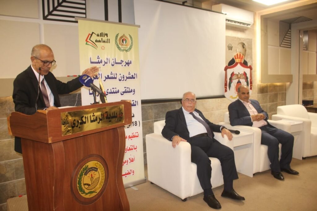 وقال الضرابعة في الحفل الذي ادار مفرداته المحامي كمال الزعبي يسعدني أن انقل إليكم تحيات معالي وزير الثقافة مصطفى الرواشدة، وأن اشارككم هذا اليوم بهجة انطلاق فعاليات مهرجان الرمثا للشعر العشرين للشعر العربي وملتقى منتدى الرمثا القصصي العربي الثاني ، هذا المهرجان الذي وقف على مدى عقدين من الزمن شاهدا على حضور الكلمة وبهاء الإبداع. وأضاف ” هنا في الرمثا نتنفس الحنين وتزهو بالعطر والشعر، تتجدد رسالة الجمال، وتنبض الحياة. وفي كلمته أشار الضرابعة إلى انطلاق الملتقى القصصي الثاني لهذا العام للمنتدى بلقاء الكلمة في أبهى تجلياتها . واختتم كلمته بالثقافة التي غدت رافعة من روافع التنمية ومحركا من محركات الوعي والاقتصاد الإنساني وفاء تتجدد فيه الروح وتتسع فيه آفاق الأمل. من جهته قال رئيس المنتدى محمد مرشد الزعبي في كلمة له ” مرحبا بالحضور ومندوب وزير الثقافة ” نلتقي اليوم مرة أخرى في مهرجان الرمثا العشرين الذي توقف لأجل غزة ، ولاننسى دور وزارة الثقافة الداعم دوما للمهرجان منذ تأسيس المنتدى وإقامة المهرجان. وفي نهاية كلمته شكر الزعبي المشاركين والحضور الذين تحملوا العناء من مختلف المحافظات . وقرأ كل من الشعراء ” محمد مقدادي، حربي المصري، خالد مياس، محمد ناجي عمايرة، محمد نصيف، قصائد عاينت أحوال الذات ، وتفاصيل الحياة وجراحات الأمة، والقدس ودمشق .